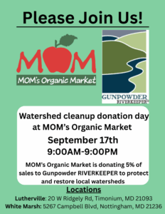Please Join Us at MOM’s Organic Market on September 17th for Watershed Cleanup Donation Day! MOM’s Organic Market will be donating 5% of sales to Gunpowder RIVERKEEPER® to help protect and restore local watersheds. If you are interested in supporting Gunpowder RIVERKEEPER®, we need volunteers to help table at MOM’s Organic Market on September 17th …