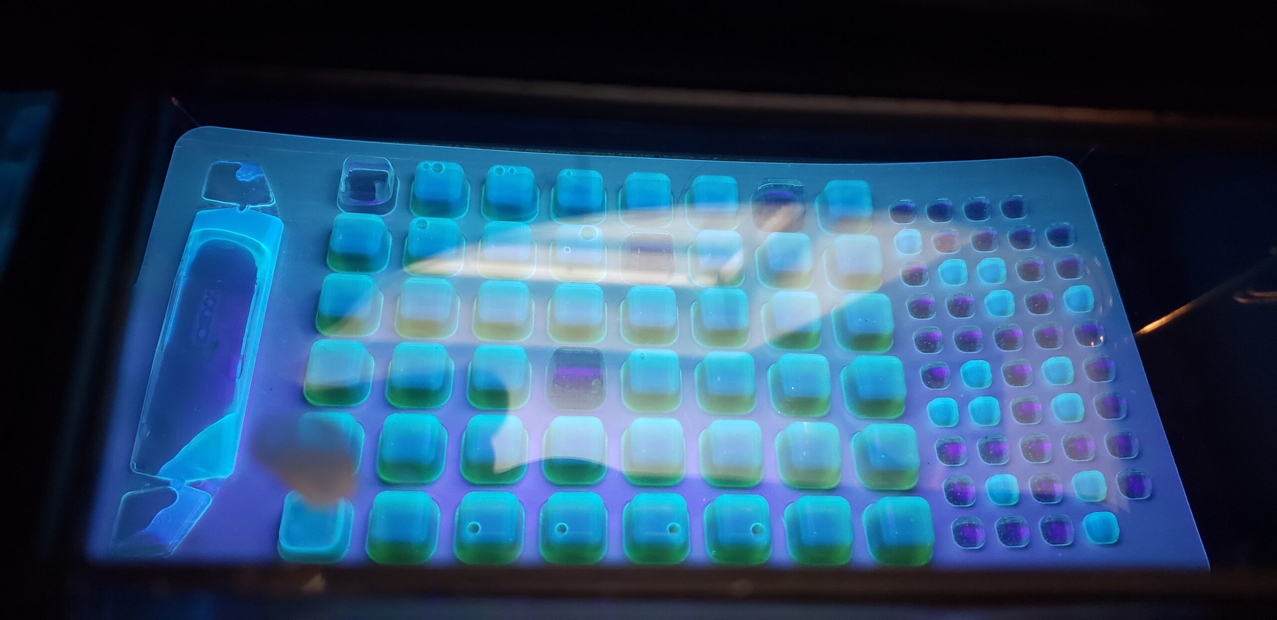 Once we received the test, all we needed to do was the same thing we did every week all summer: run the sample through the EPA approved IDEXX Method to determine the most probable number (MPN) which where on MPN is equal to one colony forming units of bacteria. We set up the test sample, sealed it in a Quanti-tray, incubated it for 18 hours, and placed it under an Ultra Violet light. The cells on the Quanti-Tray that were florescent (as seen below) indicated that bacteria was present within them. By counting up the florescent cells we used our reference sheet to determine the amount of bacterial in MPN present in the water sample.