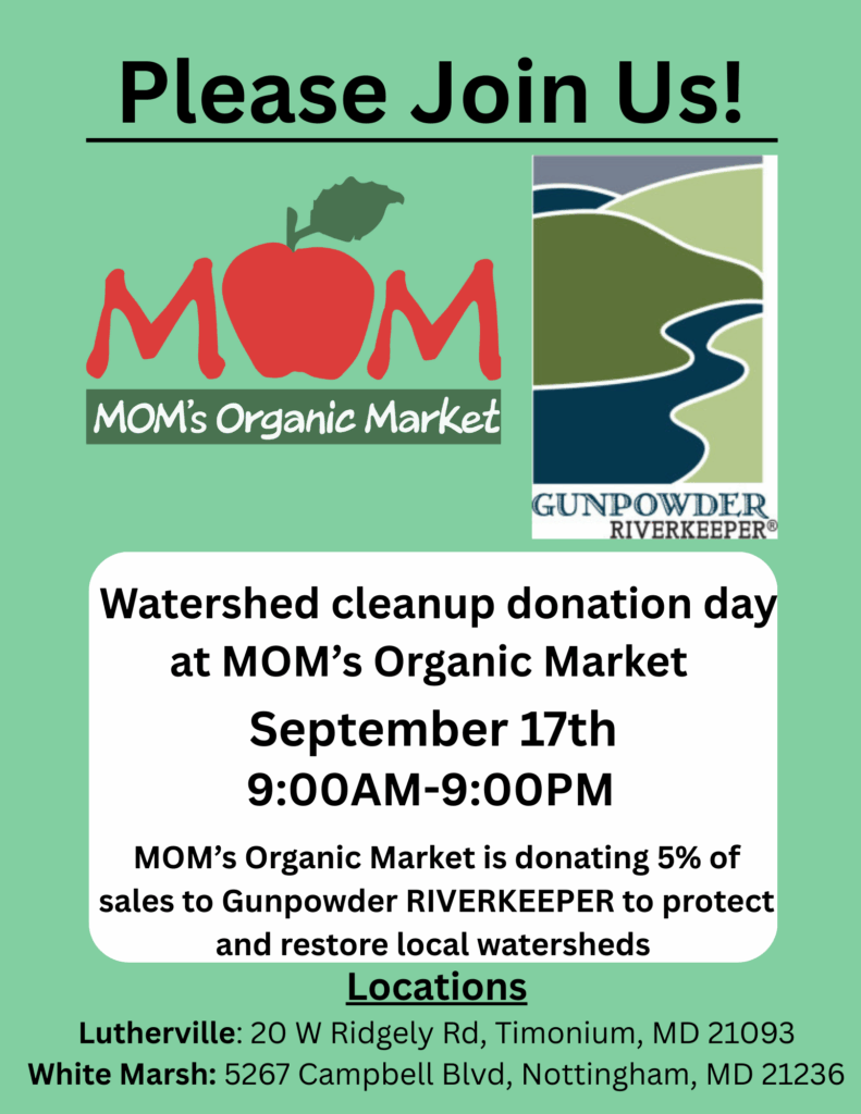 Please Join Us at MOM’s Organic Market on September 17th for Watershed Cleanup Donation Day! MOM’s Organic Market will be donating 5% of sales to Gunpowder RIVERKEEPER® to help protect and restore local watersheds.