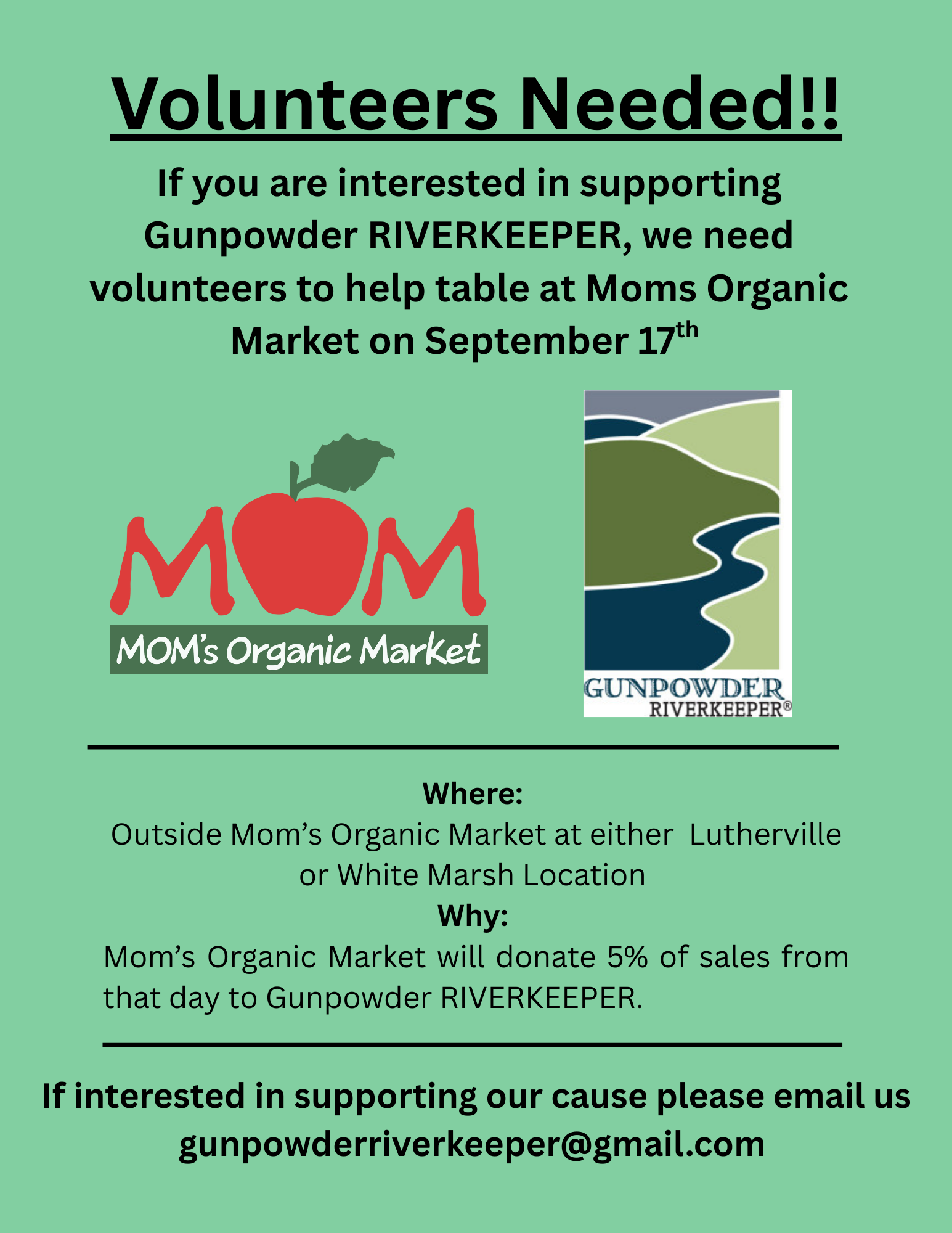 If you are interested in supporting Gunpowder RIVERKEEPER®, we need volunteers to help table at MOM’s Organic Market on September 17th for a 4 hour shift.