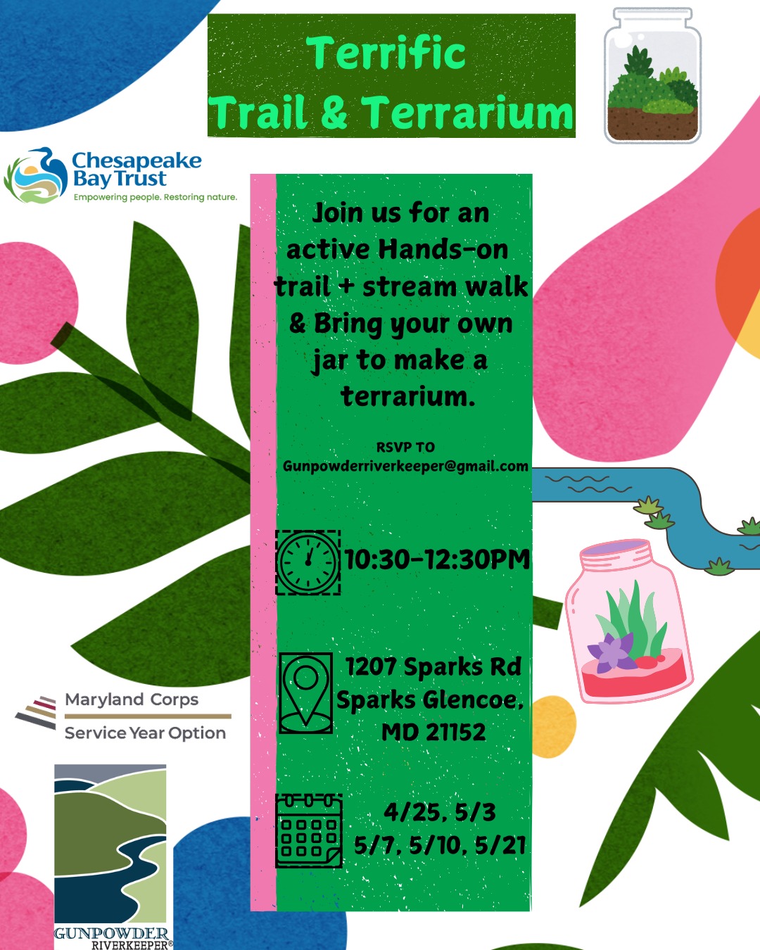 At the Sparks Bank Nature Center, learning happens through hands-on experiences, creative workshops, and time spent outdoors. Our educational events are designed to connect community members of all ages with the Gunpowder River through art, exploration, and environmental action. Whether you’re making a terrarium, cleaning a stream, or transforming trash into art, there’s always something meaningful happening here.